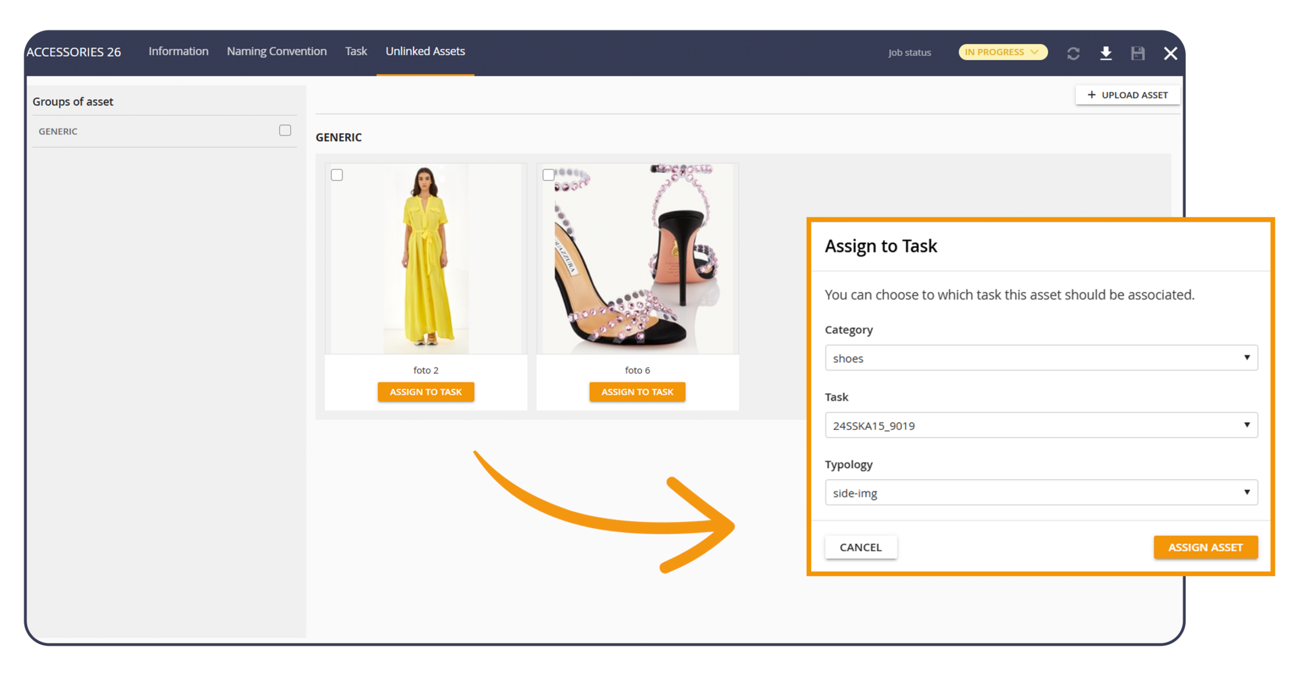 In content production, shots often arrive in advance of the definition of the final product code. Product Workflow introduces dedicated management for content still waiting to be linked to a product, so that uploading can happen immediately and association can be completed when information and codes are ready.