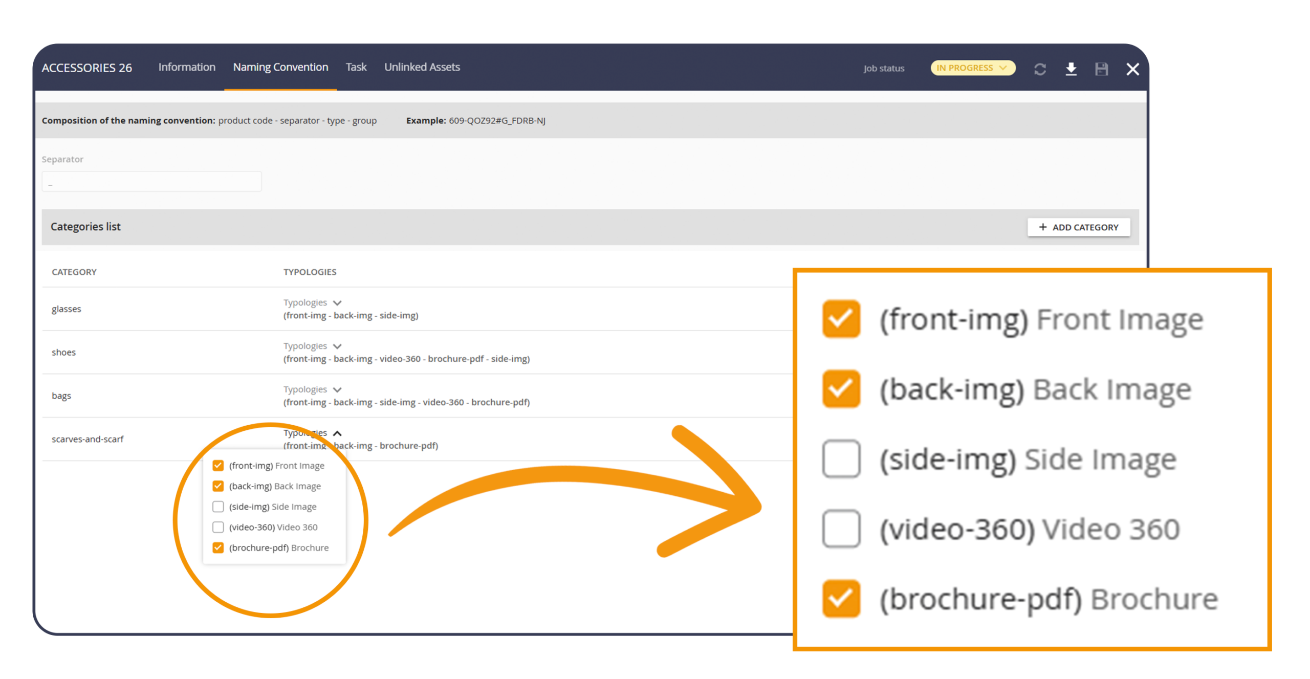 To add new typologies to an ongoing job, simply open the Naming convention section and use the dedicated dropdown for typologies to select those to include. Saving immediately updates the job, making the new typologies operational while respecting already set rules and assignments, so that the flow remains unique and consistent.