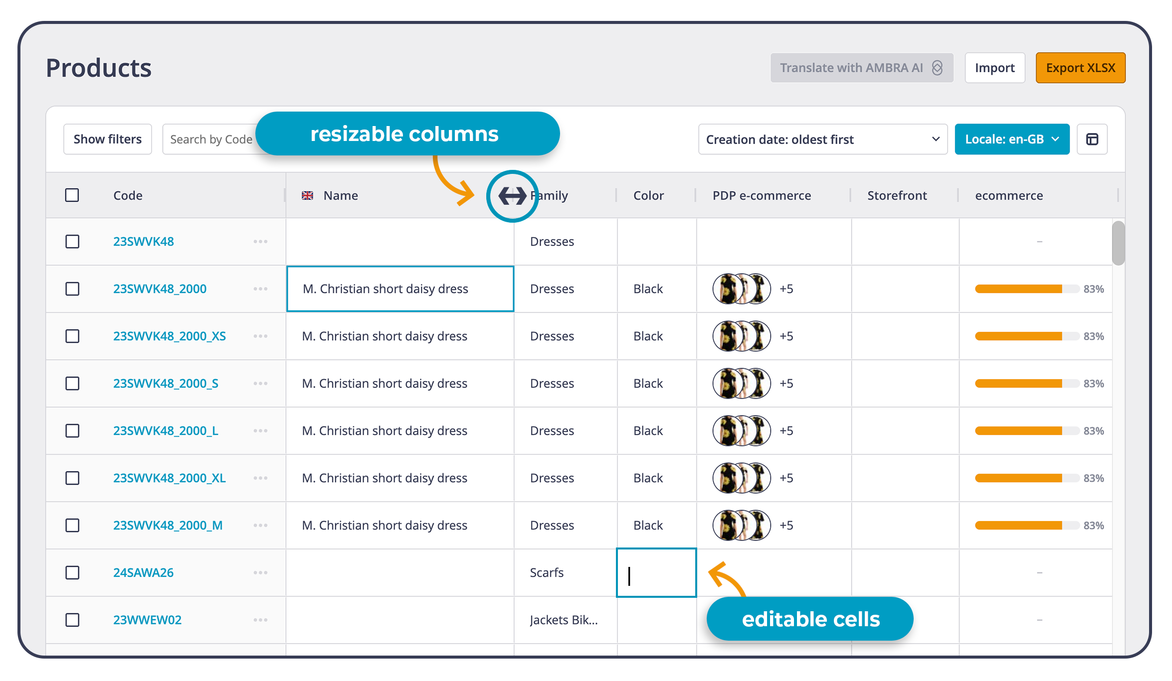 You can easily monitor attribute status, quickly identifying those missing for distribution to specific channels. AMBRA AI can support you in completing them, suggesting content to generate or translate as needed.