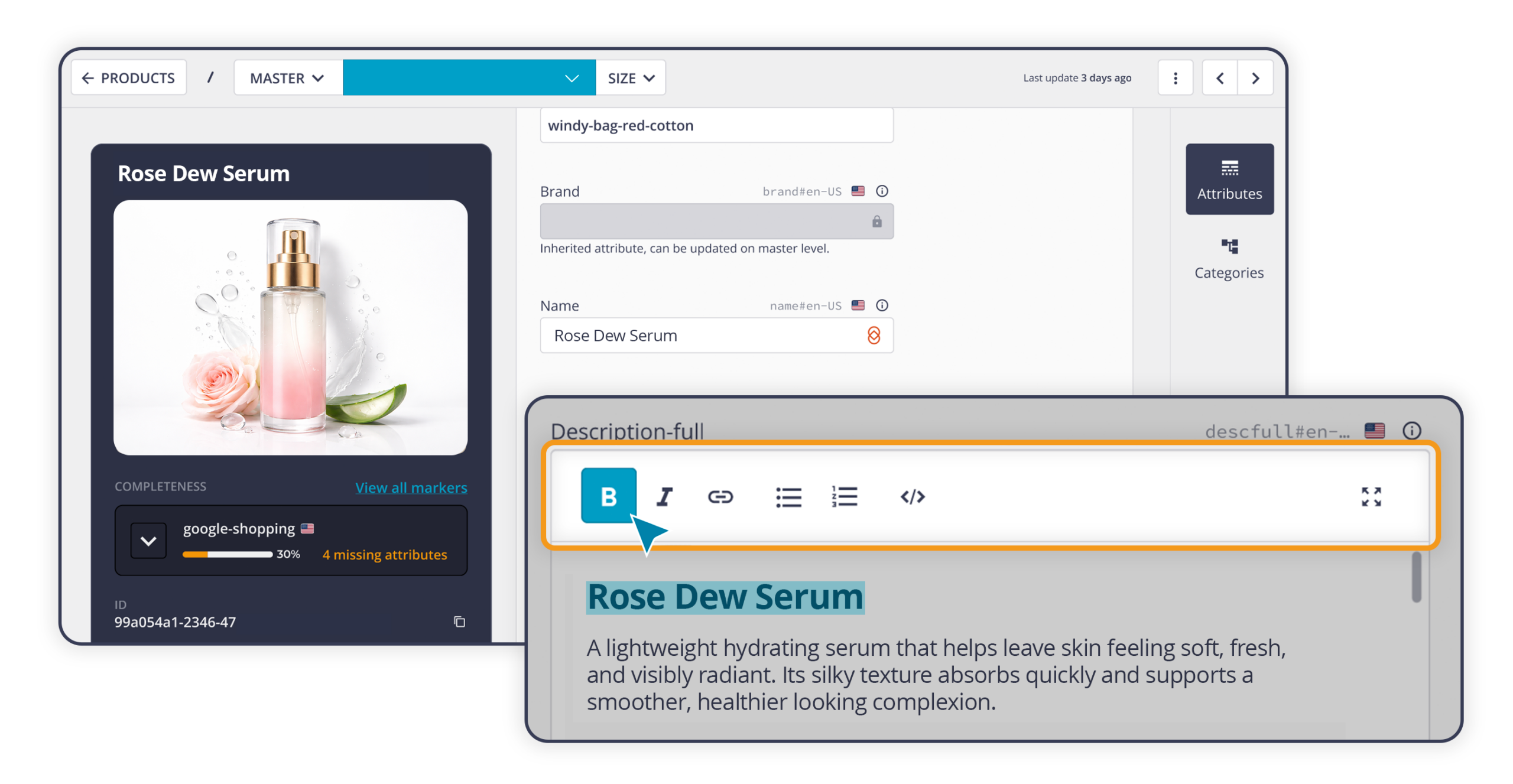 This feature allows you to define the completion status of product sheets based on highly customizable criteria, with the ability to:
